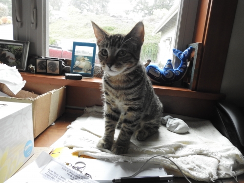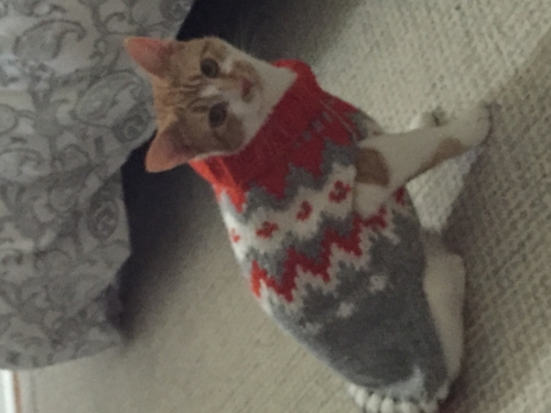 The picture is of me in my favorite wool sweater when we go for rides in my "doggy-turned-kitty" pet stroller.
