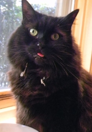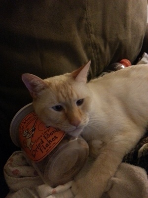 My cat, Houdini, is a bonito flake addict. He normally does not eat cat treats, but he goes insane for Cat Man Doo bonito flakes. If I ever want to find him, all I have to do is open the top of the container and he comes running to me for his bonito fix. Here he is tonight showing his bonito flake love.