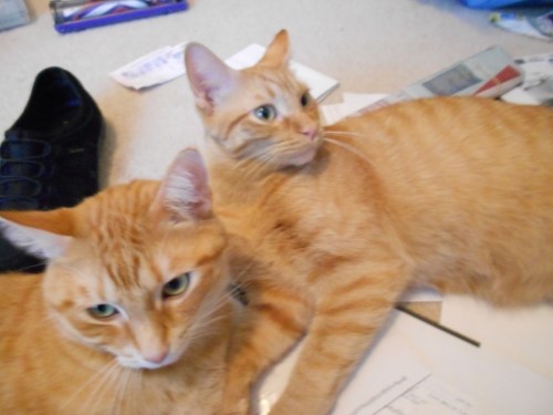 My cats are spoiled by your chiicken and fish products! They want to try the Salmon next time I order! The larger one is Bowie, 3 yrs. old, and The smaller(head only in this picture, they are actually around the same size NOW)is Finian -